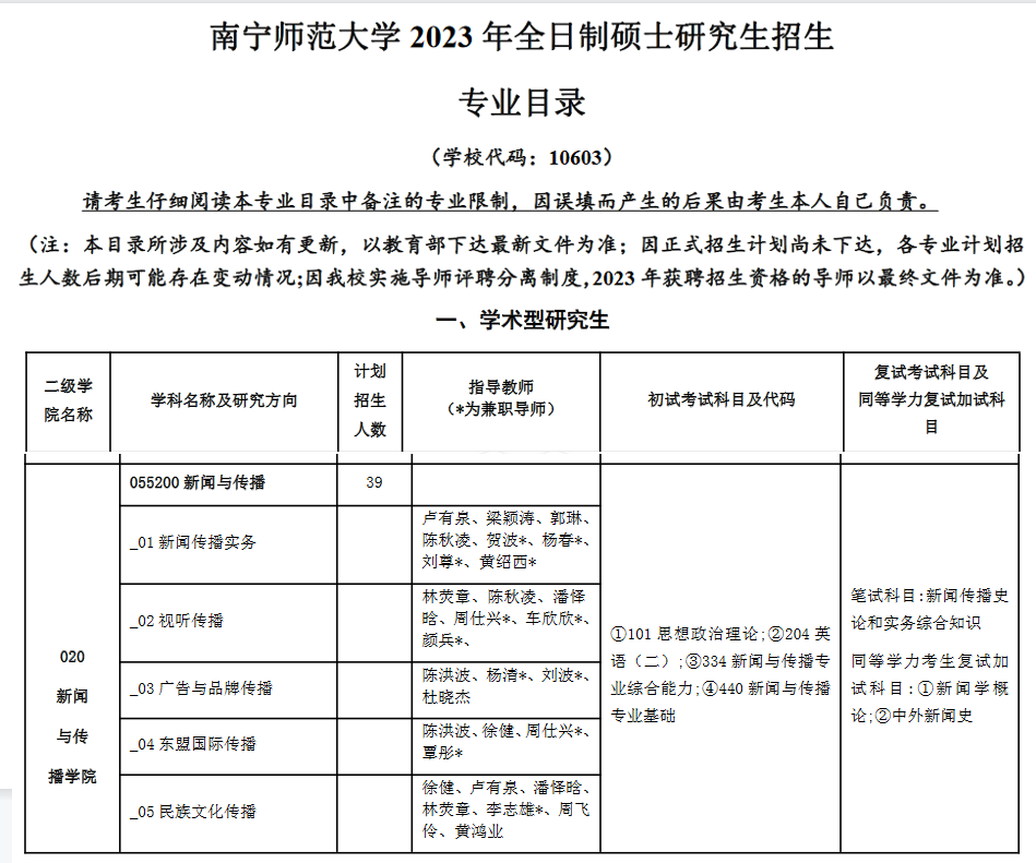 1.南宁师范大学2023年全日制硕士研究生招生专业目录
