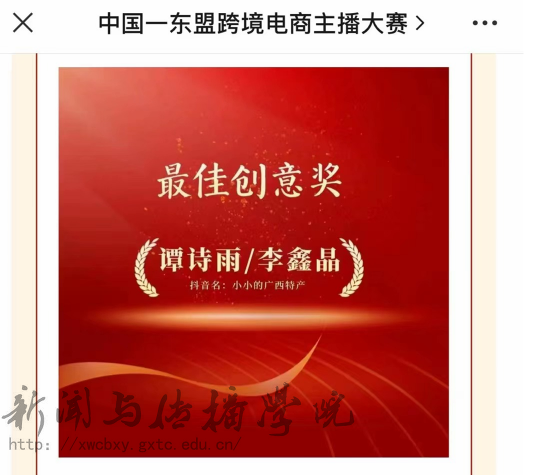 近日,2023年首届中国—东盟跨境电商主播大赛决赛圆满落幕。我院播音与主持艺术专业2021级1班谭诗雨同学、李鑫晶同学两人入围十强,斩获单项奖“最佳创意奖”。