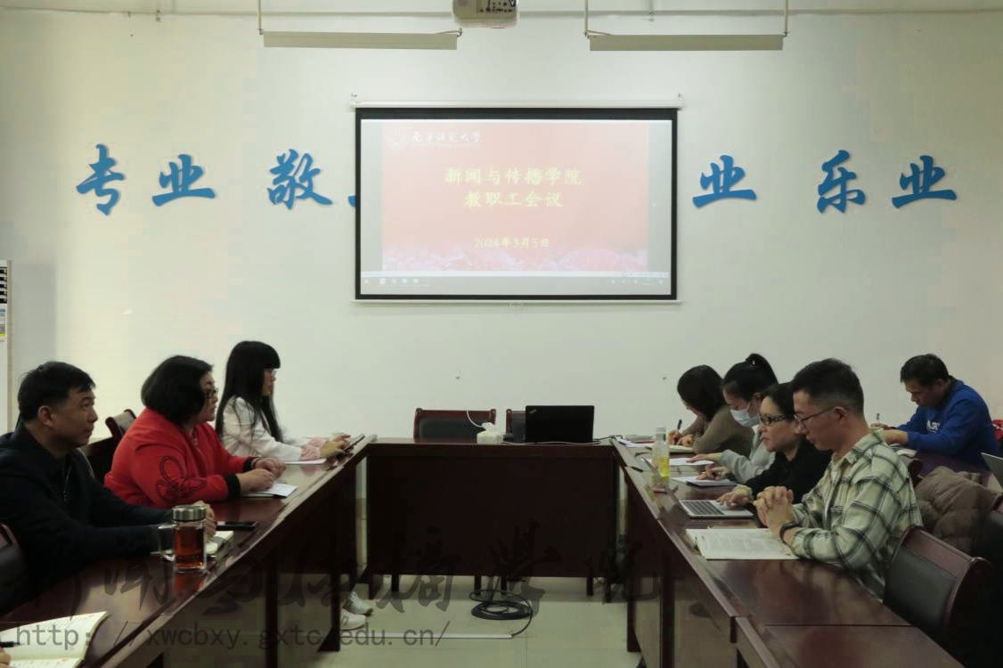 为推动本学期学院各项工作顺利开展,3月5日15时,新闻与传播学院于理综楼304会议室召开教职工会议。此次会议由学院党委书记聂卉主持,学院领导班子和全体教职工参加。