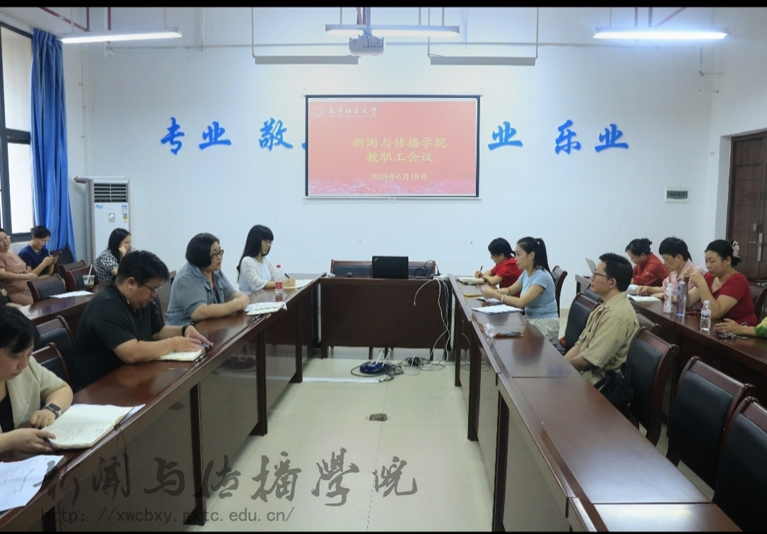 6月18日15时,新闻传播学院于理综楼304室召开全体教职工会议。本次会议由学院党委书记聂卉主持,学院领导和全体教职工参加。