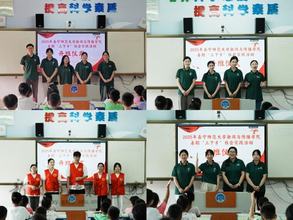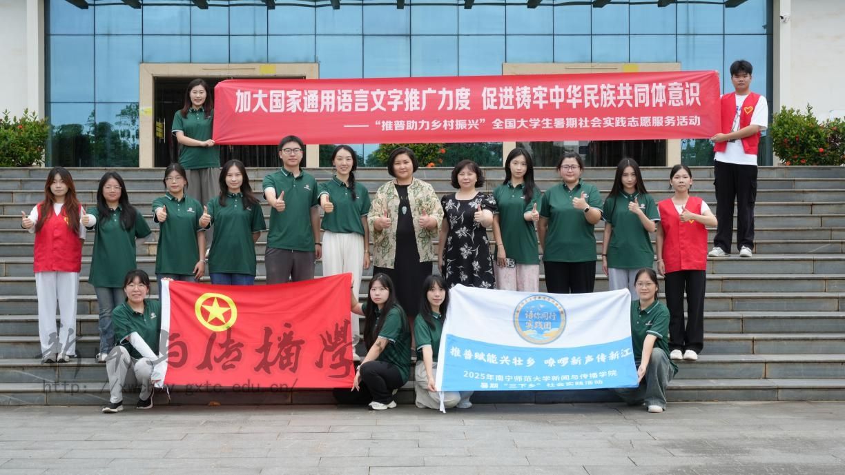为响应党的二十大“加大国家通用语言文字推广力度”的号召,紧扣2025年全国普通话普及率85%的关键节点。南宁师范大学新闻与传播学院“语”你同行实践团在学院团委书记李樱花带队下,于2025年7月12日赴南宁市新江镇中心小学,启动“推普赋能兴壮乡,嘹啰新声传新江”主题实践活动。当日上午,学院举行出征仪式,学院党委书记聂卉和学院党委副书记黄敏来到出征仪式现场,为即将投身国家通用语言文字推广一线的 18 名学生加油鼓劲,鼓励大家积极投入工作,在实践中发挥作用。