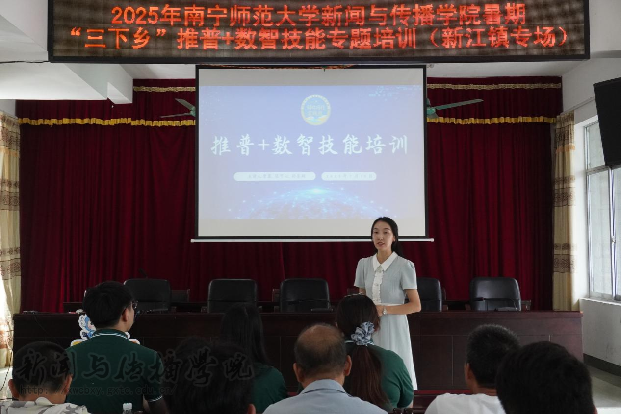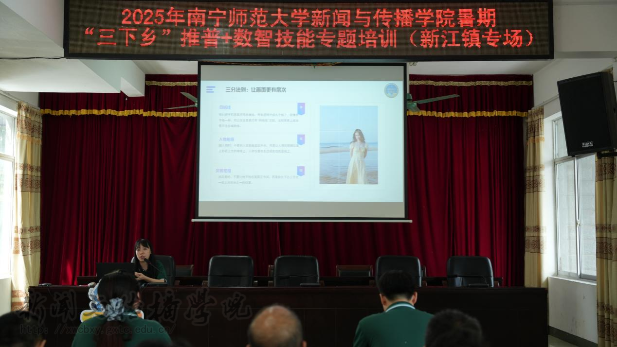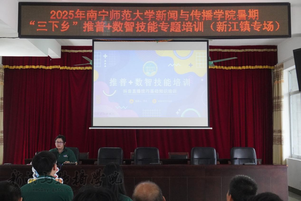 7月15日上午,新闻与传播学院暑期“三下乡”“语”你同行实践团在邕宁区新江镇人民政府会议室开展“推普+数智技能培训”专题会。新江镇团委书记邓媛方、新闻与传播学院团委书记李樱花,以及新江镇各村干部群众代表和 “语”你同行实践团成员到场参加。会议由新江镇团委书记邓媛方主持。本次培训会分为“直播技巧”“短视频拍摄”和“无人机使用”三部分。