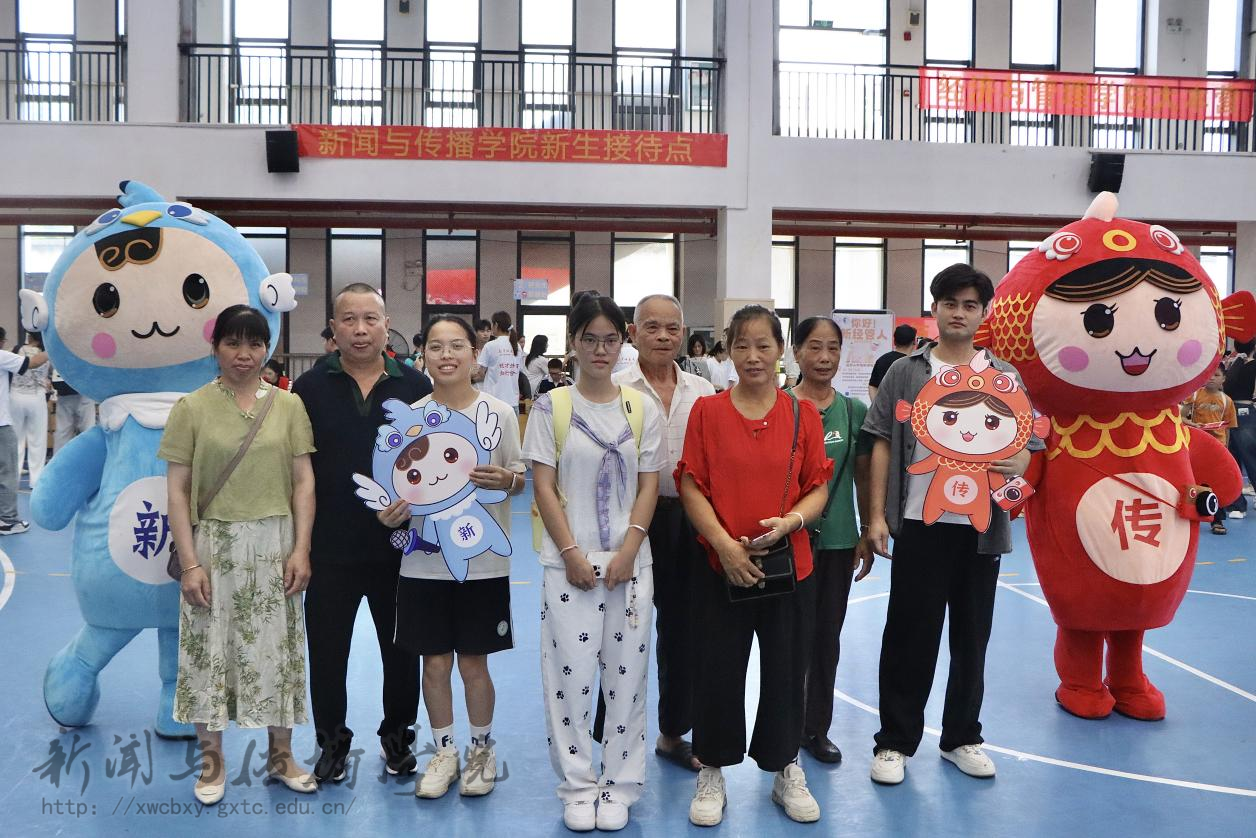 (新生及家长与学院吉祥物合影)