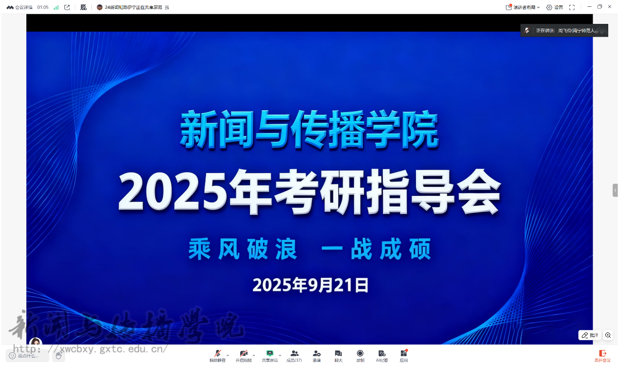 为切实帮助有考研意向的学生厘清备考思路、破解复习困惑,明确冲刺方向,9月21日晚,新闻与传播学院以线上会议形式成功举办了2025年考研指导会。学院院长梁颖涛、党委副书记黄敏、副院长周飞伶受邀出席并分享指导,2022级、2023级全体有考研计划的学生积极参会,会议由学院辅导员惠旋全程主持。