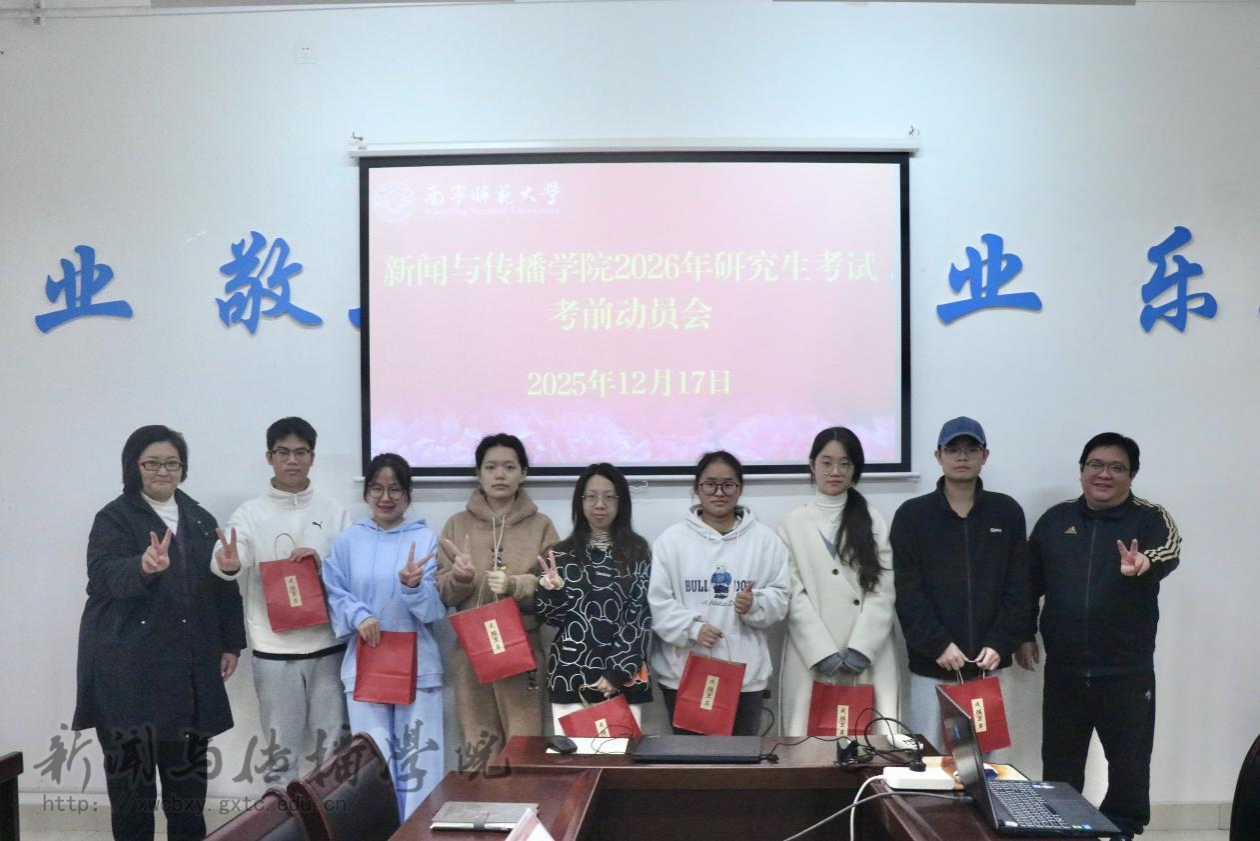 12月17日上午,新闻与传播学院在理综楼304会议室隆重举行2026年研究生考试考前动员会暨诚信教育专项活动。学院党委书记聂卉、院长梁颖涛、党委副书记黄敏以及2022级全体考研学子参加活动。活动由学工办辅导员惠旋主持。