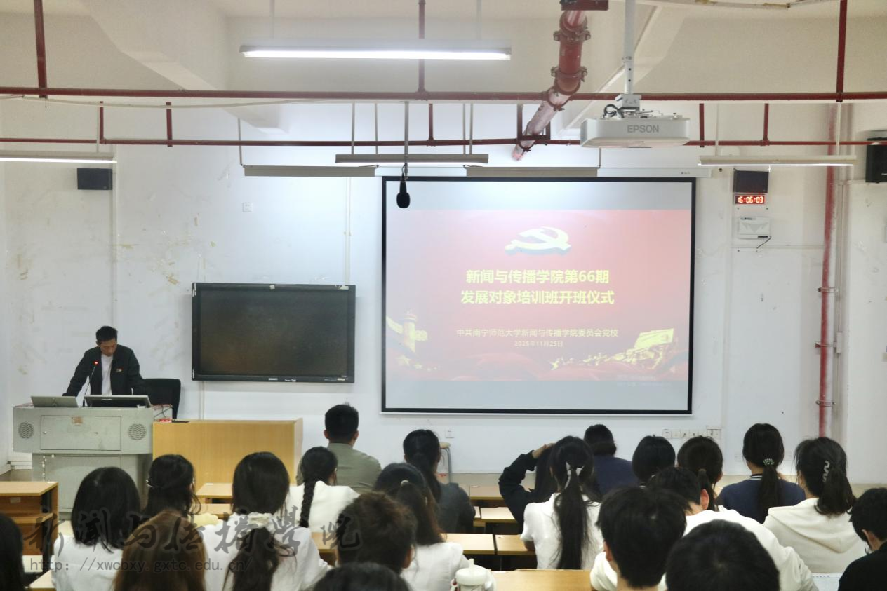 11月25日下午,新闻与传播学院在文综601教室举行第66期发展对象培训班开班仪式。学院党委书记聂卉、学工办辅导员李虹霏、兰浩玮及全体学员参加开班仪式。仪式由学院党委组织员廖林泉主持。