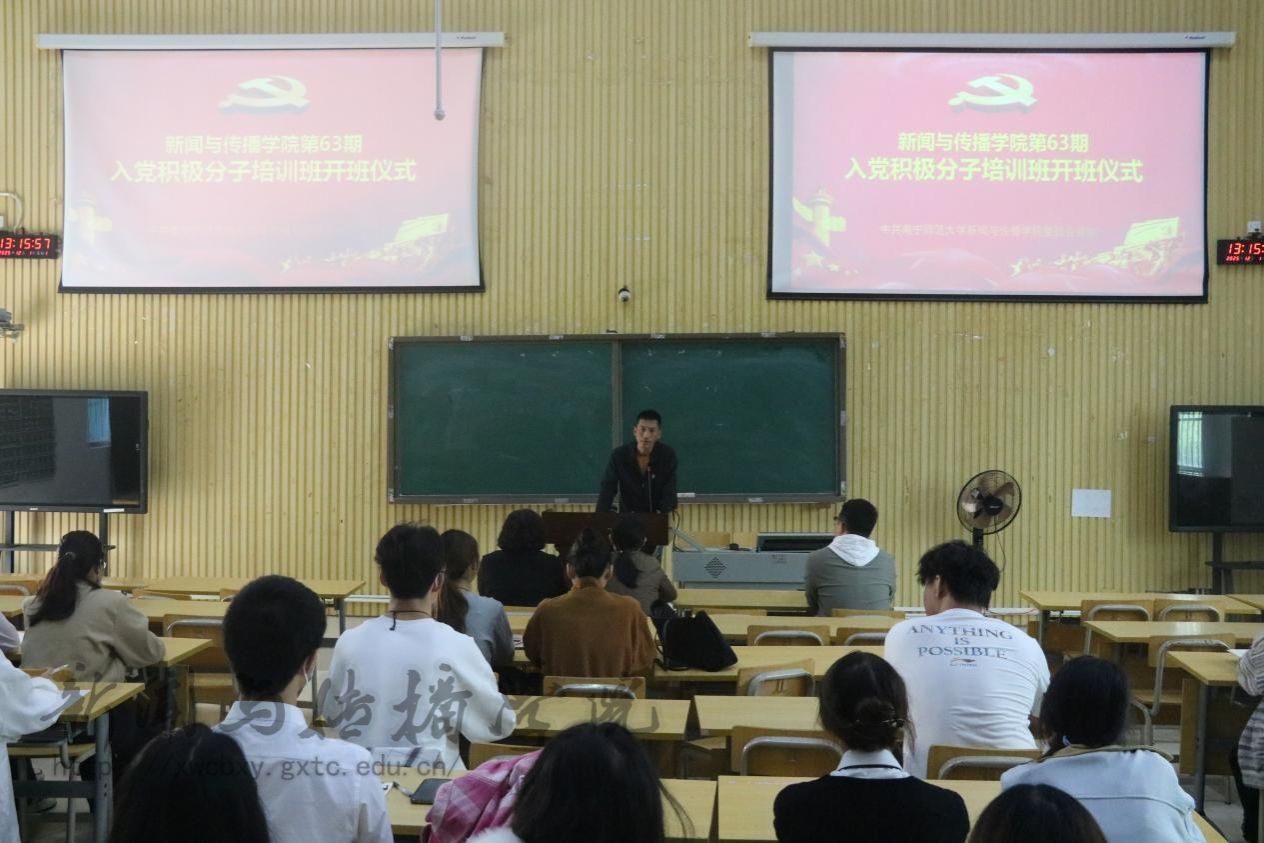 12月1日中午,新闻与传播学院第63期入党积极分子培训班开班仪式在五综107教室进行。学院党委副书记黄敏,学院党委专职组织员廖林泉,学工办辅导员惠旋、兰浩玮,以及全体学员参加仪式。开班仪式由廖林泉老师主持。