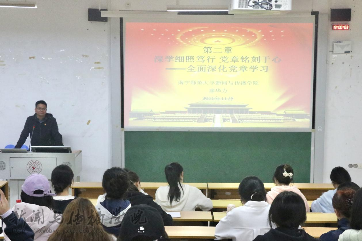11 月 27 日晚,南宁师范大学新闻与传播学院第 66 期发展对象培训班第三讲在文综 401 教室顺利举行。本次培训由学院党委委员廖华力老师主讲,旨在引导发展对象深化党章学习、强化党性修养,为成长为合格共产党员筑牢思想根基。