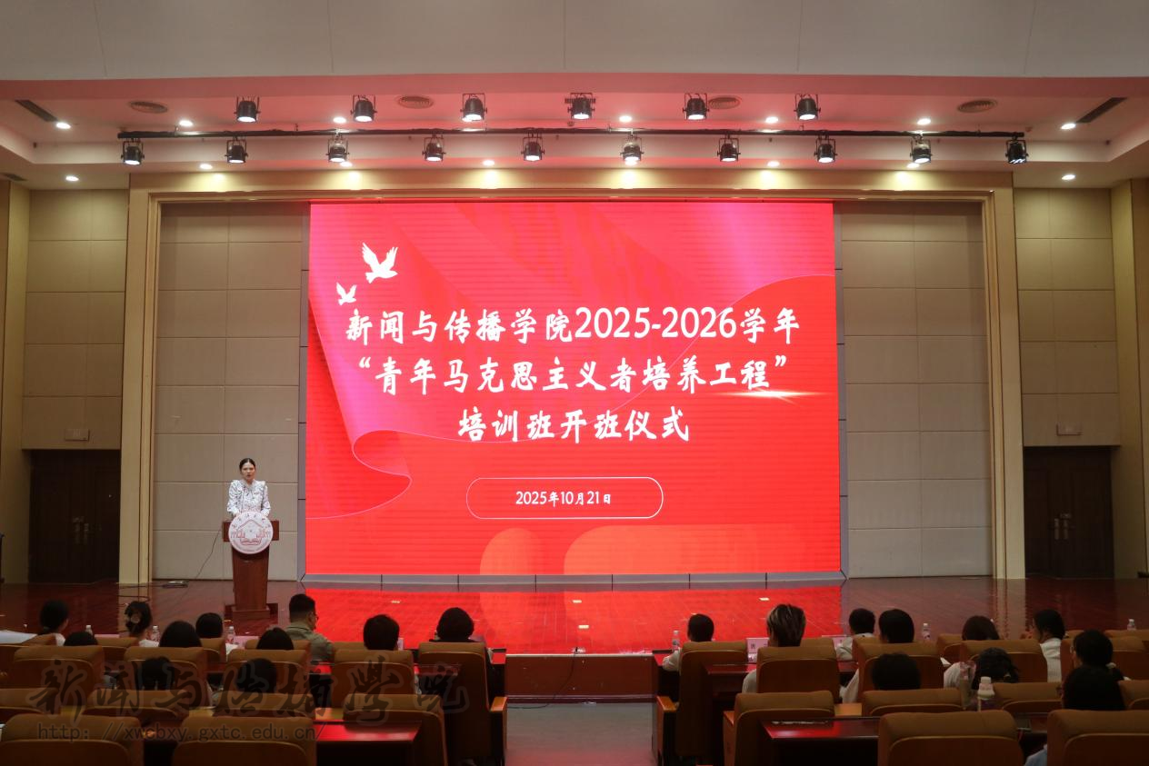 10月21日晚,新闻与传播学院于文综114报告厅举行2025-2026学年“青年马克思主义者培养工程”培训班开班仪式。学院党委副书记黄敏、学工办辅导员李虹霏、兰浩玮、唐兰、覃力及“青马班”全体成员参加。开班仪式由辅导员惠旋主持。