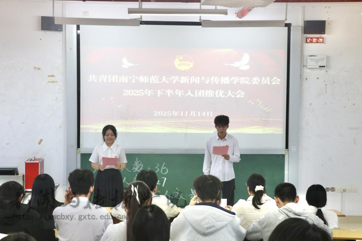11月14日中午,新闻与传播学院在文综401教室召开2025年下半年入团推优大会。学工办辅导员惠旋、各班团支书及入团积极分子参加本次会议。