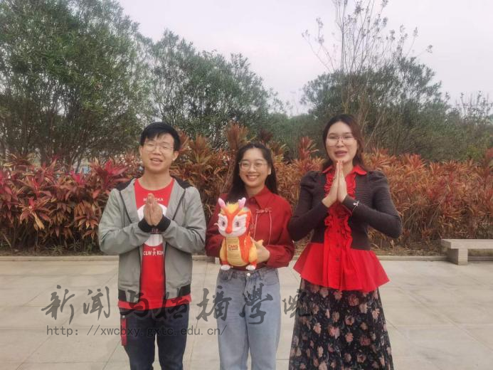 图6 老挝留学生康麦(左)、宁宁(右),泰国留学生冯春雨(中)一起拜年