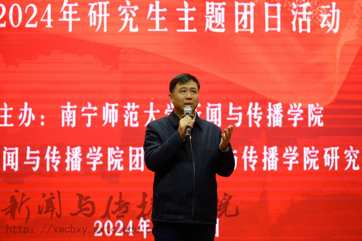 活动在团歌中拉开帷幕。学院党委副书记、院长陈洪波致辞,他首先代表学院党委行政向此次活动的成功举办付出辛勤汗水的师生们表示衷心感谢。陈洪波院长谈到,新闻与传播学院在2023年迎来了三件大事:一是迎来校友“归家”共庆学校70周年校庆,加强了学院与校友之间的联系;二是成功通过了2023年学位授权点专项核验检查;三是全面启动教学改革,“高质量发展 品牌八桂行”联合采访活动顺利开展,“广西品牌与文化传播研究中心”和“南宁师大一带一路与文明互鉴中心”两大科研平台建立,研究生人才培养的创新工程全面启动,研究生的成长环境、培养机制正在持续优化,学院发展欣欣向荣。最后,他为全院师生送上了新学期的祝福。