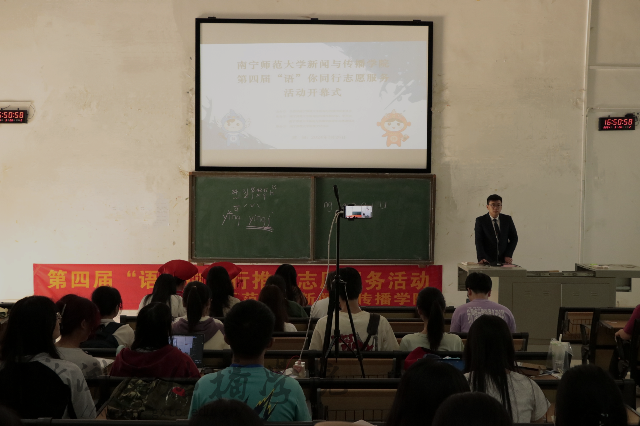 开幕式伊始,谭李丹同学回顾了往届“语”你同行志愿服务的活动成果,并介绍本届活动的主要安排。今年的“语”你同行活动将采取线上线下同步授课的方式,开展“字正腔圆”普通话技巧培训、“能说会道”主持技巧培训、“经典诵读”朗诵比赛、“多彩乡音”方言交流、“大手拉小手,学好普通话”培训。此外,本次活动将广西特色民族文化和语言文化融入培训课程,在帮助提高同学们普通话水平的同时促进民族团结和语言文化交流。