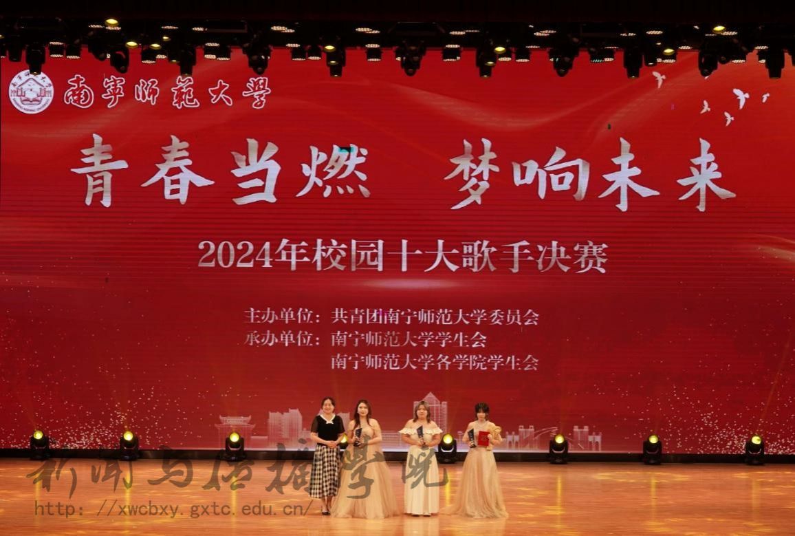 5月12日晚,南宁师范大学2024年“青春当燃,梦响未来”校园十大歌手决赛在武鸣校区音乐楼1号报告厅拉下帷幕,我院23新传专硕的陈紫萱同学和22播主班的庞雯楣同学凭借出色的表现分别荣获冠军和季军。