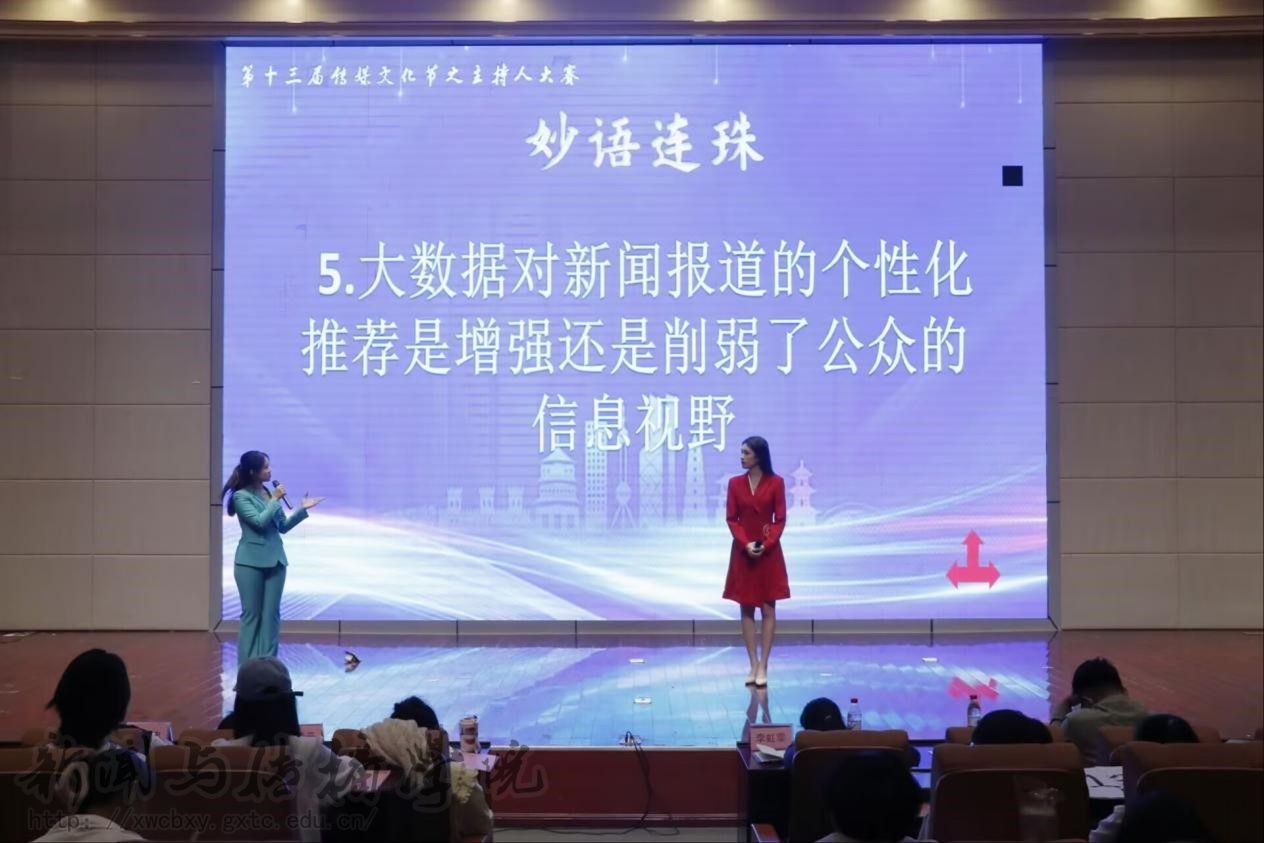 11月7日晚,新闻与传播学院在文综楼114报告厅举办第十三届传媒文化节主持人大赛决赛。本次比赛邀请了播音与主持专业的唐衍欢、李倩云、邓忠三位老师担任评委。
