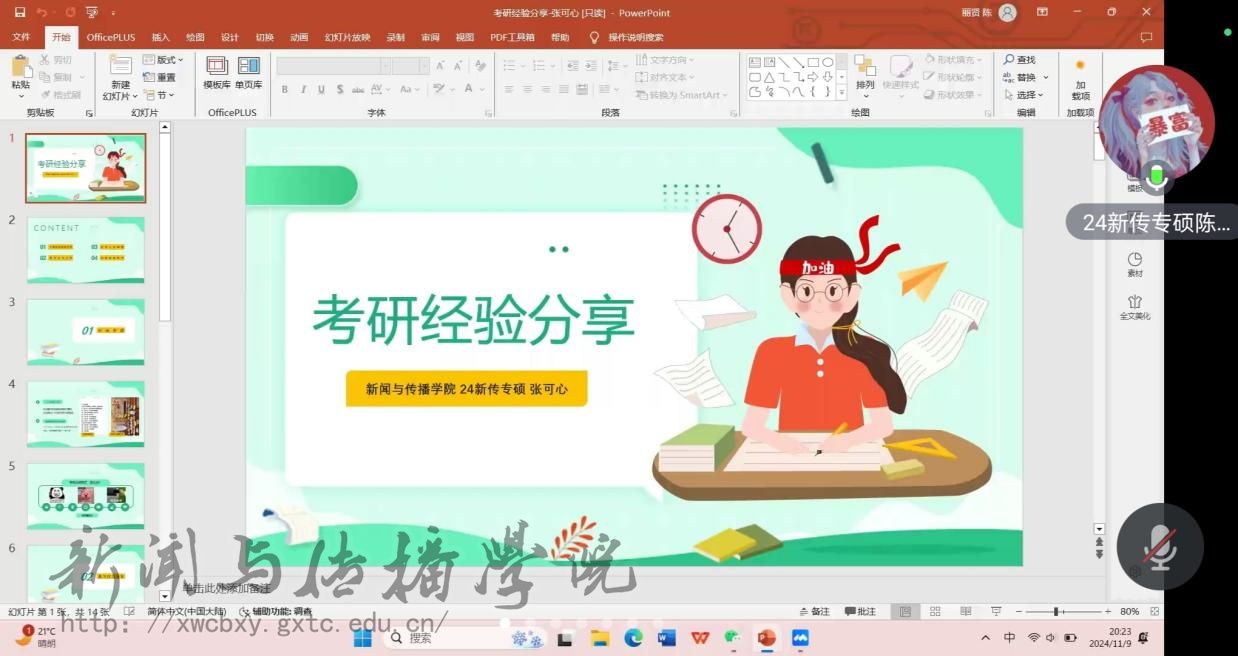 新闻与传播学院于 11 月 9 日晚举办了一场考研经验线上分享会,旨在为有志于考研的在校学生提供实用指导与经验借鉴。本次分享会邀请到 2024 届考研成绩优异的毕业生代表陈丽贤和张可心两位同学,通过线上平台分享她们的考研心得,学院辅导员惠璇老师也同步参与,活动由团委学习部罗程程同学主持。