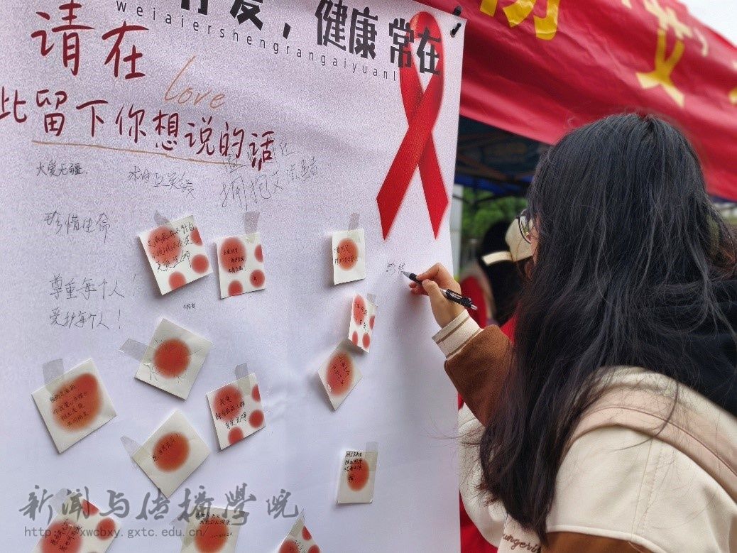 防艾留言板前,爱意流淌,希望满溢。同学们纷纷拿起笔,将对艾滋病患者的诚挚鼓励、对防艾事业的热切期望与坚定支持化作一行行温暖有力的文字,书写在留言板上,每一字句皆饱含着人性的光辉与善意。而在 “拥抱艾滋病人” 区域,真情互动令人动容。24 新闻班的黄芝桦同学化身 “艾滋病患者”,手举 “我是一位艾滋病患者,可以给我个拥抱吗?” 的醒目示意牌,诚挚邀请过往同学给予拥抱。当一个个温暖的拥抱接踵而至,不仅驱散了冬日的严寒,更传递出爱与接纳的强大力量。黄芝桦同学感慨道:“当有人主动拥抱我时,内心瞬间被一股暖流填满。拥抱不会传播艾滋,愿每一位艾滋病患者都能被世界温柔以待,收获满满的善意与温暖怀抱。”