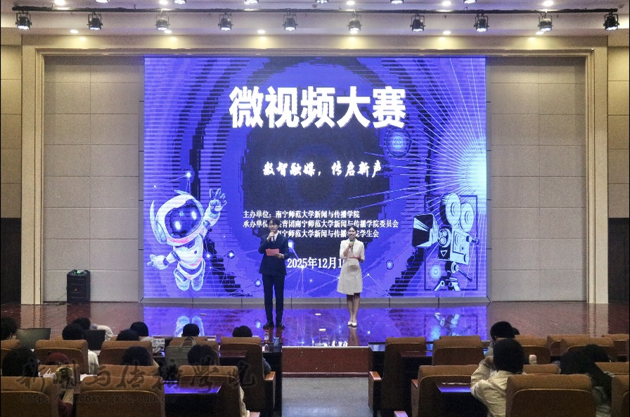 12月10日晚,南宁师范大学新闻与传播学院第十四届传媒文化节之微视频大赛决赛在文综楼114报告厅举办。本次大赛以“AI 赋能 智创时代”为核心主题,邀请胡建军、邓之湄、黄予晞三位专业教师担任评委,学工办辅导员覃力莅临现场指导,为全院学子呈现了一场融合科技与创意的视听盛宴。