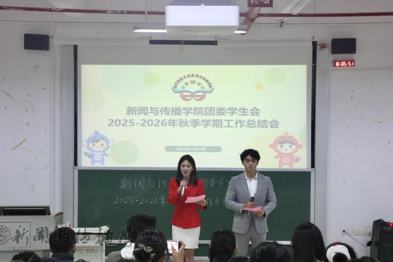 12月25日晚,新闻与传播学院在文综801教室召开2025-2026年秋季学期工作总结会。学工办辅导员惠旋、兰浩玮、覃力以及团委、学生会各部门和各社团成员参加本次会议。