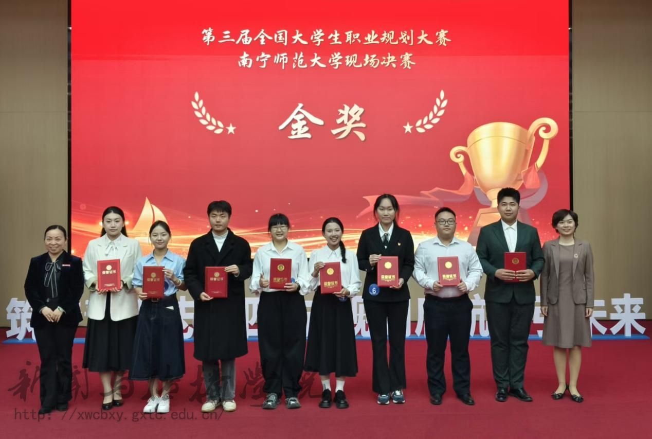 12月6日,第三届全国高校大学生职业规划大赛南宁师范大学决赛在明秀校区圆满落幕。新闻与传播学院2024级研究生周月婷凭借清晰的职业定位、扎实的专业积淀与出色的现场表现,在研究生就业赛道激烈角逐中脱颖而出,成功斩获金奖,充分展现了新传学子的职业素养与青春风采。