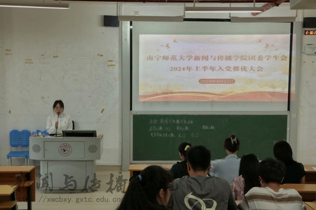 4月22日中午,新闻与传播学院团委、学生会在文综楼401室召开2024年上半年入党推优大会,团委书记李樱花,团委、学生会成员参加。本次会议由团委组织部副部长覃家丽主持。