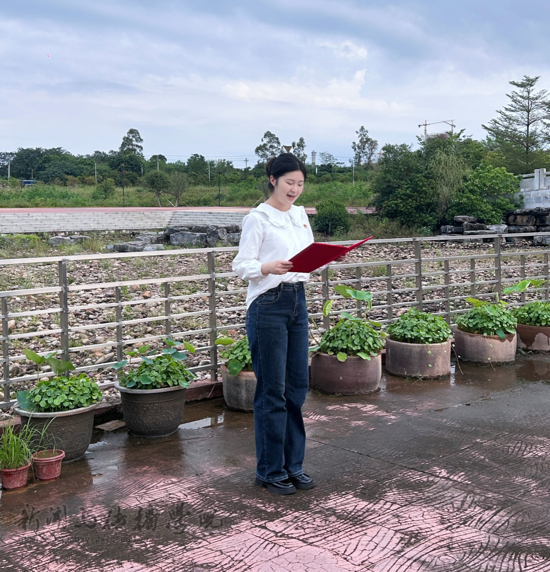 活动伊始,黄敏副书记带领全体党员前往莲花观景平台。党员们驻足欣赏莲花“中通外直、不蔓不枝”的形态特点,深切体悟“出淤泥而不染、濯清涟而不妖”的高尚品格。学生党员陈秋水在现场诵读经典篇目《爱莲说》,其清朗有力的诵读声传递出莲花所蕴含的君子之风,让在场党员直观地感受到莲花精神与共产党人清廉本色的内在契合,推动“以莲为廉”的理念深入人心,为后续的廉洁教育奠定了思想共鸣基础。