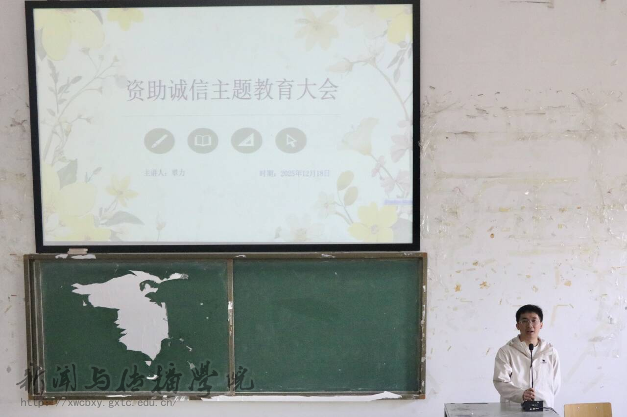 12月18日中午,新闻与传播学院于五综楼308教室召开资助诚信主题教育大会。本次会议由学工办辅导员覃力主讲,团委学生会资助部成员、各班资助委员及2025-2026学年获得各类奖助学金的学生参加会议。