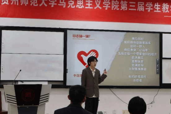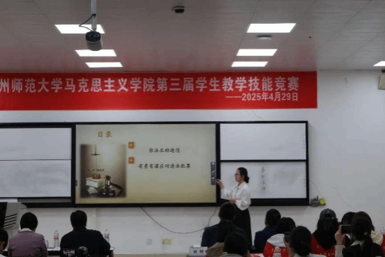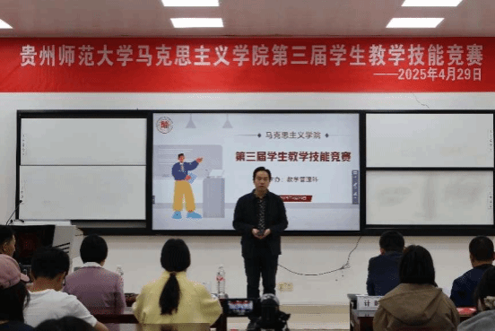 为了贯彻落实习近平新时代中国特色社会主义思想和党的二十大精神,全面落实新时代全国高等学校本科教育工作会议精神,夯实马克思主义理论专业能力基础,促进学生理论与实践结合的专业成长,增强学生就业竞争力,2025年4月29日上午,贵州师范大学马克思主义学院在公教GJ3213多媒体教室成功举办第三届学生教学技能竞赛。宋小红、吕敬美、朱彦瑾、杨明东、卢勇五位老师受邀担任比赛评委。经过班级内部选拔,来自不同年级的六组本科学生脱颖而出,齐聚学院教学技能竞赛决赛现场,展开角逐。